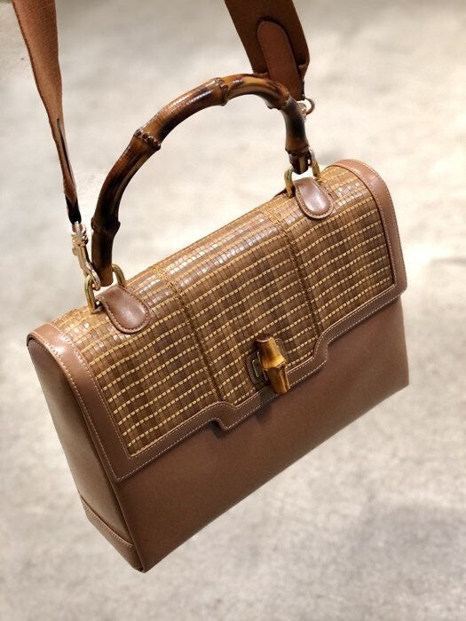 Extremely Rare GUCCI VINTAGE 100% Genuine Leather Weave Turn Lock Bamboo Handle Two Way Kelly Handbag, Caramel Brown, Gift for Fashionista